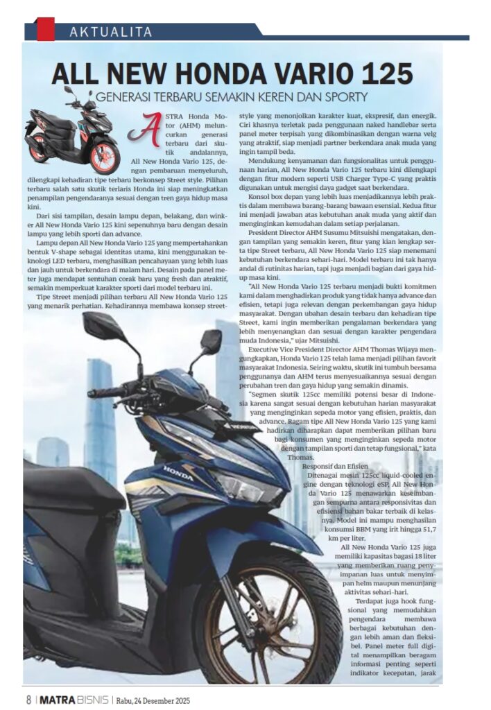 ALL NEW HONDA VARIO 125 – GENERASI TERBARU SEMAKIN KEREN DAN SPORTY by Sri Yuliantiningsih 19 Desember 2025 in Silahkan buka . You Might Like Regional Public Launching New ADV160 The SUV Pride Grand Launching New PCX 160 Truly Exceptional! Tetap hati-hati ya bro sist berkendara saat hujan.