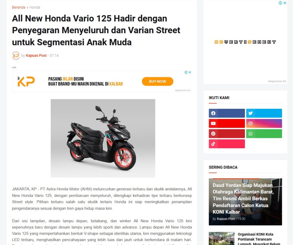 All New Honda Vario 125 Hadir dengan Penyegaran Menyeluruh dan Varian Street untuk Segmentasi Anak Muda by Muhammad Arif 6 Desember 2025 in Silahkan kunjungi https://www.kapuaspost.web.id/2025/12/all-new-honda-vario-125-hadir-dengan.html. Tags: astra Astra Motor kalbar Astra Motor Pontianak astramotor honda kalbar pontianak sepeda motor You Might Like Regional Public Launching New ADV160 The SUV Pride Grand Launching New PCX 160 Truly Exceptional! Tetap hati-hati ya bro sist berkendara saat hujan.