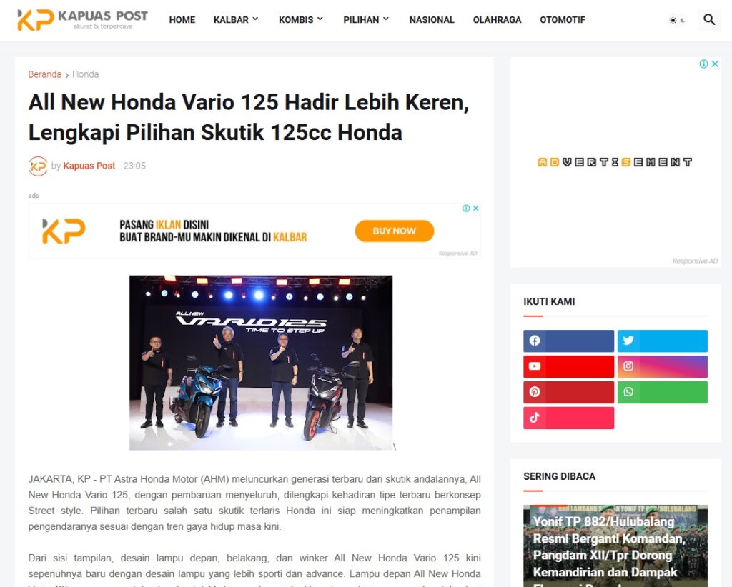 All New Honda Vario 125 Hadir Lebih Keren, Lengkapi Pilihan Skutik 125cc Honda by Muhammad Arif 23 Januari 2026 in Silahkan kunjungi https://www.kapuaspost.web.id/2026/01/all-new-honda-vario-125-hadir-lebih_28.html. Tags: astra Astra Motor kalbar Astra Motor Pontianak astramotor honda kalbar pontianak sepeda motor You Might Like Regional Public Launching New ADV160 The SUV Pride Grand Launching New PCX 160 Truly Exceptional! Tetap hati-hati ya bro sist berkendara saat hujan.