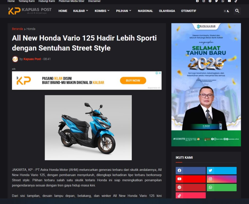 All New Honda Vario 125 Hadir Lebih Sporti dengan Sentuhan Street Style by Muhammad Arif 5 Januari 2026 in Silahkan kunjungi https://www.kapuaspost.web.id/2026/01/all-new-honda-vario-125-hadir-lebih.html. Tags: astra Astra Motor kalbar Astra Motor Pontianak astramotor honda kalbar pontianak sepeda motor You Might Like Regional Public Launching New ADV160 The SUV Pride Grand Launching New PCX 160 Truly Exceptional! Tetap hati-hati ya bro sist berkendara saat hujan.