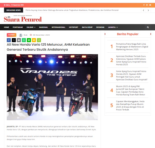 All New Honda Vario 125 Meluncur, AHM Keluarkan Generasi Terbaru Skutik Andalannya by masmul 8 Desember 2025 in Silahkan kunjungi https://www.suarapemredkalbar.com/read/potret/08122025/all-new-honda-vario-125-meluncur-ahm-keluarkan-generasi-terbaru-skutik-andalannya. You Might Like Regional Public Launching New ADV160 The SUV Pride Grand Launching New PCX 160 Truly Exceptional! Tetap hati-hati ya bro sist berkendara saat hujan.