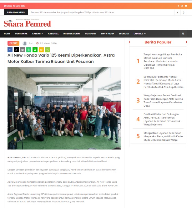 All New Honda Vario 125 Resmi Diperkenalkan, Astra Motor Kalbar Terima Ribuan Unit Pesanan by masmul 2 Maret 2026 in Silahkan kunjungi https://www.suarapemredkalbar.com/read/potret/02032026/all-new-honda-vario-125-resmi-diperkenalkan-astra-motor-kalbar-terima-ribuan-unit-pesanan. You Might Like Regional Public Launching New ADV160 The SUV Pride Grand Launching New PCX 160 Truly Exceptional! Tetap hati-hati ya bro sist berkendara saat hujan.
