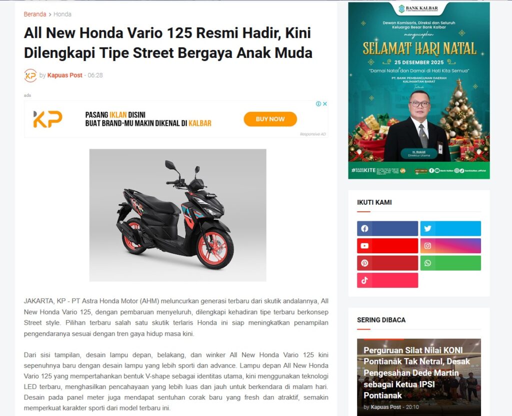 All New Honda Vario 125 Resmi Hadir, Kini Dilengkapi Tipe Street Bergaya Anak Muda by Muhammad Arif 23 Desember 2025 in Silahkan kunjungi https://www.kapuaspost.web.id/2025/12/all-new-honda-vario-125-resmi-hadir.html. Tags: astra Astra Motor kalbar Astra Motor Pontianak astramotor honda kalbar pontianak sepeda motor You Might Like Regional Public Launching New ADV160 The SUV Pride Grand Launching New PCX 160 Truly Exceptional! Tetap hati-hati ya bro sist berkendara saat hujan.