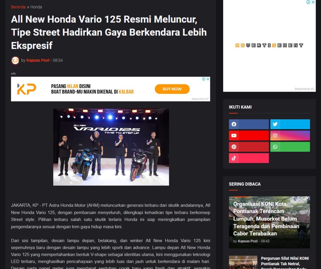 All New Honda Vario 125 Resmi Meluncur, Tipe Street Hadirkan Gaya Berkendara Lebih Ekspresif by Muhammad Arif 16 Desember 2025 in Silahkan kunjungi https://www.kapuaspost.web.id/2025/12/all-new-honda-vario-125-resmi-meluncur_16.html. Tags: astra Astra Motor kalbar Astra Motor Pontianak astramotor honda kalbar pontianak sepeda motor You Might Like Regional Public Launching New ADV160 The SUV Pride Grand Launching New PCX 160 Truly Exceptional! Tetap hati-hati ya bro sist berkendara saat hujan.