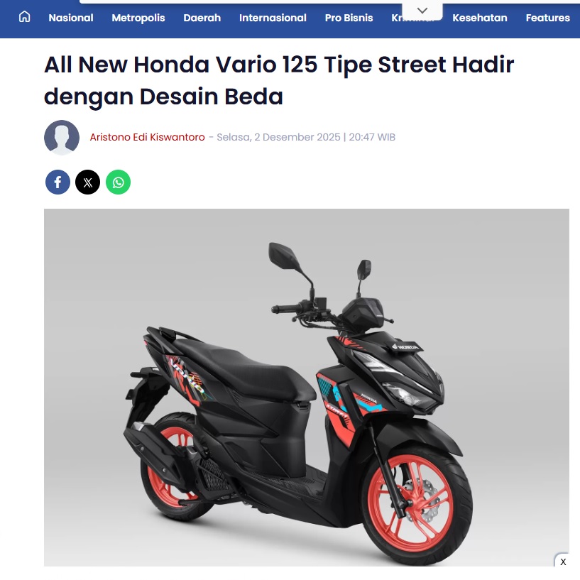 All New Honda Vario 125 Tipe Street Hadir dengan Desain Beda by Aristono Edi Kiswantoro 2 Desember 2025 in Silahkan kunjungi https://pontianakpost.jawapos.com/pro-bisnis/1466907286/all-new-honda-vario-125-tipe-street-hadir-dengan-desain-beda. You Might Like Regional Public Launching New ADV160 The SUV Pride Grand Launching New PCX 160 Truly Exceptional! Tetap hati-hati ya bro sist berkendara saat hujan.