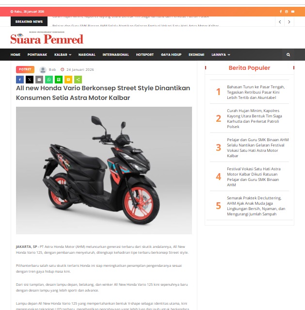 All new Honda Vario Berkonsep Street Style Dinantikan Konsumen Setia Astra Motor Kalbar by masmul 24 Januari 2026 in Silahkan kunjungi https://www.suarapemredkalbar.com/read/potret/24012026/all-new-honda-vario-berkonsep-street-style-dinantikan-konsumen-setia-astra-motor-kalbar. You Might Like Regional Public Launching New ADV160 The SUV Pride Grand Launching New PCX 160 Truly Exceptional! Tetap hati-hati ya bro sist berkendara saat hujan.