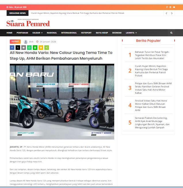 All New Honda Vario: New Colour Usung Tema Time To Step Up, AHM Berikan Pembaharuan Menyeluruh by masmul 24 Januari 2026 in Silahkan kunjungi https://www.suarapemredkalbar.com/read/potret/24012026/all-new-honda-vario-new-colour-usung-tema-time-to-step-up-ahm-berikan-pembaharuan-menyeluruh. You Might Like Regional Public Launching New ADV160 The SUV Pride Grand Launching New PCX 160 Truly Exceptional! Tetap hati-hati ya bro sist berkendara saat hujan.