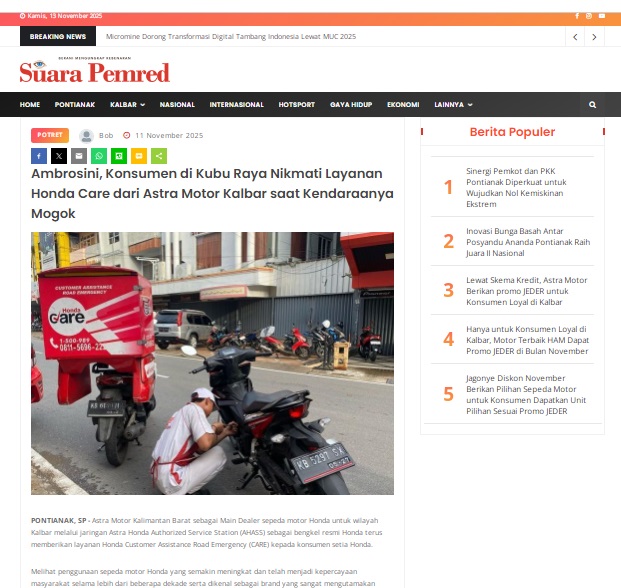 Ambrosini, Konsumen di Kubu Raya Nikmati Layanan Honda Care dari Astra Motor Kalbar saat Kendaraanya Mogok by masmul 11 November 2025 in Silahkan kunjungi https://www.suarapemredkalbar.com/read/potret/11112025/ambrosini-konsumen-di-kubu-raya-nikmati-layanan-honda-care-dari-astra-motor-kalbar-saat-kendaraanya-mogok. You Might Like Regional Public Launching New ADV160 The SUV Pride Grand Launching New PCX 160 Truly Exceptional! Tetap hati-hati ya bro sist berkendara saat hujan.