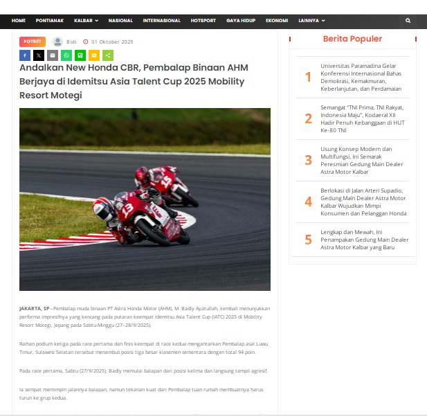 Andalkan New Honda CBR, Pembalap Binaan AHM Berjaya di Idemitsu Asia Talent Cup 2025 Mobility Resort Motegi by masmul 1 Oktober 2025 in Silahkan kunjungi https://www.suarapemredkalbar.com/read/potret/01102025/andalkan-new-honda-cbr-pembalap-binaan-ahm-berjaya-di-idemitsu-asia-talent-cup-2025-mobility-resort-motegi. You Might Like Regional Public Launching New ADV160 The SUV Pride Grand Launching New PCX 160 Truly Exceptional! Tetap hati-hati ya bro sist berkendara saat hujan.