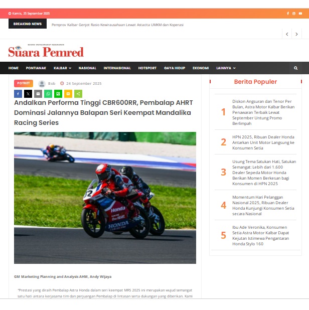 Andalkan Performa Tinggi CBR600RR, Pembalap AHRT Dominasi Jalannya Balapan Seri Keempat Mandalika Racing Series by masmul 24 September 2025 in Silahkan kunjungi https://www.suarapemredkalbar.com/read/potret/24092025/andalkan-performa-tinggi-cbr600rr-pembalap-ahrt-dominasi-jalannya-balapan-seri-keempat-mandalika-racing-series. You Might Like Regional Public Launching New ADV160 The SUV Pride Grand Launching New PCX 160 Truly Exceptional! Tetap hati-hati ya bro sist berkendara saat hujan.