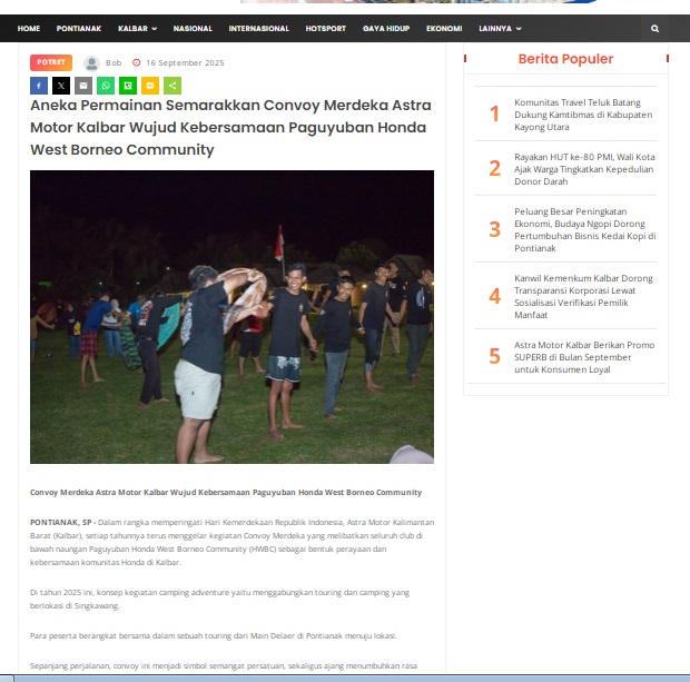 Aneka Permainan Semarakkan Convoy Merdeka Astra Motor Kalbar Wujud Kebersamaan Paguyuban Honda West Borneo Community by masmul 16 September 2025 in Silahkan kunjungi https://www.suarapemredkalbar.com/read/potret/16092025/aneka-permainan-semarakkan-convoy-merdeka-astra-motor-kalbar-wujud-kebersamaan-paguyuban-honda-west-borneo-community. You Might Like Regional Public Launching New ADV160 The SUV Pride Grand Launching New PCX 160 Truly Exceptional! Tetap hati-hati ya bro sist berkendara saat hujan.