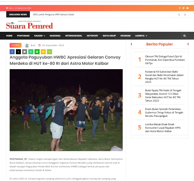 Anggota Paguyuban HWBC Apresiasi Gelaran Convoy Merdeka di HUT ke-80 RI dari Astra Motor Kalbar by masmul 20 September 2025 in Silahkan kunjungi https://www.suarapemredkalbar.com/read/potret/20092025/anggota-paguyuban-hwbc-apresiasi-gelaran-convoy-merdeka-di-hut-ke-80-ri-dari-astra-motor-kalbar. You Might Like Regional Public Launching New ADV160 The SUV Pride Grand Launching New PCX 160 Truly Exceptional! Tetap hati-hati ya bro sist berkendara saat hujan.