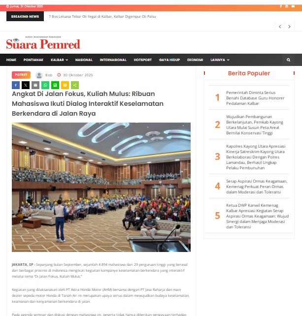 Angkat Di Jalan Fokus, Kuliah Mulus: Ribuan Mahasiswa Ikuti Dialog Interaktif Keselamatan Berkendara di Jalan Raya by masmul 30 Oktober 2025 in Silahkan kunjungi https://www.suarapemredkalbar.com/read/potret/30102025/angkat-di-jalan-fokus-kuliah-mulus-ribuan-mahasiswa-ikuti-dialog-interaktif-keselamatan-berkendara-di-jalan-raya. You Might Like Regional Public Launching New ADV160 The SUV Pride Grand Launching New PCX 160 Truly Exceptional! Tetap hati-hati ya bro sist berkendara saat hujan.