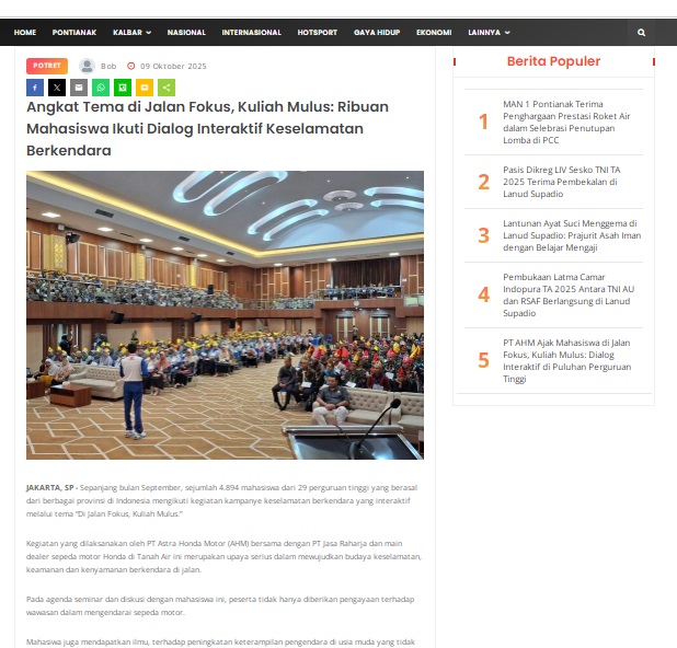 Angkat Tema di Jalan Fokus, Kuliah Mulus: Ribuan Mahasiswa Ikuti Dialog Interaktif Keselamatan Berkendara by masmul 9 Oktober 2025 in Silahkan kunjungi https://www.suarapemredkalbar.com/read/potret/09102025/angkat-tema-di-jalan-fokus-kuliah-mulus-ribuan-mahasiswa-ikuti-dialog-interaktif-keselamatan-berkendara. You Might Like Regional Public Launching New ADV160 The SUV Pride Grand Launching New PCX 160 Truly Exceptional! Tetap hati-hati ya bro sist berkendara saat hujan.