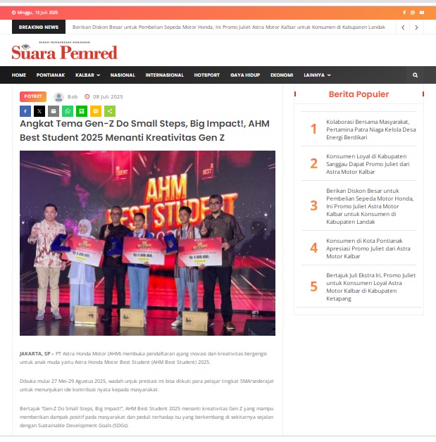 Angkat Tema Gen-Z Do Small Steps, Big Impact!, AHM Best Student 2025 Menanti Kreativitas Gen Z by masmul 8 Juli 2025 in Silahkan kunjungi https://www.suarapemredkalbar.com/read/potret/08072025/angkat-tema-gen-z-do-small-steps-big-impact-ahm-best-student-2025-menanti-kreativitas-gen-z. You Might Like Regional Public Launching New ADV160 The SUV Pride Grand Launching New PCX 160 Truly Exceptional! Tetap hati-hati ya bro sist berkendara saat hujan.