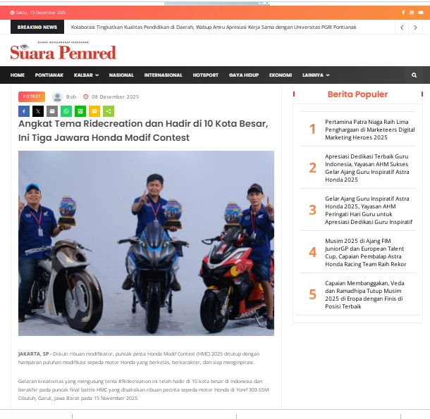 Angkat Tema Ridecreation dan Hadir di 10 Kota Besar, Ini Tiga Jawara Honda Modif Contest by masmul 8 Desember 2025 in Silahkan kunjungi https://www.suarapemredkalbar.com/read/potret/08122025/angkat-tema-ridecreation-dan-hadir-di-10-kota-besar-ini-tiga-jawara-honda-modif-contest. You Might Like Regional Public Launching New ADV160 The SUV Pride Grand Launching New PCX 160 Truly Exceptional! Tetap hati-hati ya bro sist berkendara saat hujan.
