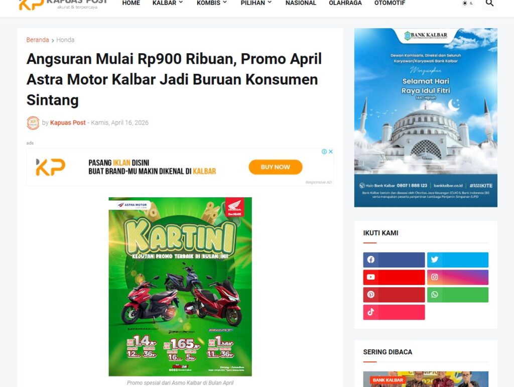 Angsuran Mulai Rp900 Ribuan, Promo April Astra Motor Kalbar Jadi Buruan Konsumen Sintang by Muhammad Arif 16 April 2026 in Silahkan kunjungi https://www.kapuaspost.web.id/2026/04/angsuran-mulai-rp900-ribuan-promo-april.html. Tags: astra Astra Motor kalbar Astra Motor Pontianak astramotor honda kalbar pontianak sepeda motor You Might Like Regional Public Launching New ADV160 The SUV Pride Grand Launching New PCX 160 Truly Exceptional! Tetap hati-hati ya bro sist berkendara saat hujan.