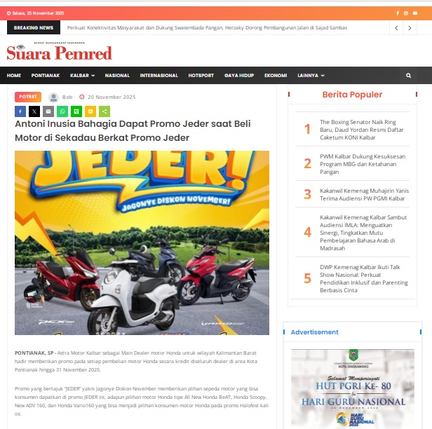 Antoni Inusia Bahagia Dapat Promo Jeder saat Beli Motor di Sekadau Berkat Promo Jeder by masmul 20 November 2025 in Silahkan kunjungi https://www.suarapemredkalbar.com/read/potret/20112025/antoni-inusia-bahagia-dapat-promo-jeder-saat-beli-motor-di-sekadau-berkat-promo-jeder. You Might Like Regional Public Launching New ADV160 The SUV Pride Grand Launching New PCX 160 Truly Exceptional! Tetap hati-hati ya bro sist berkendara saat hujan.