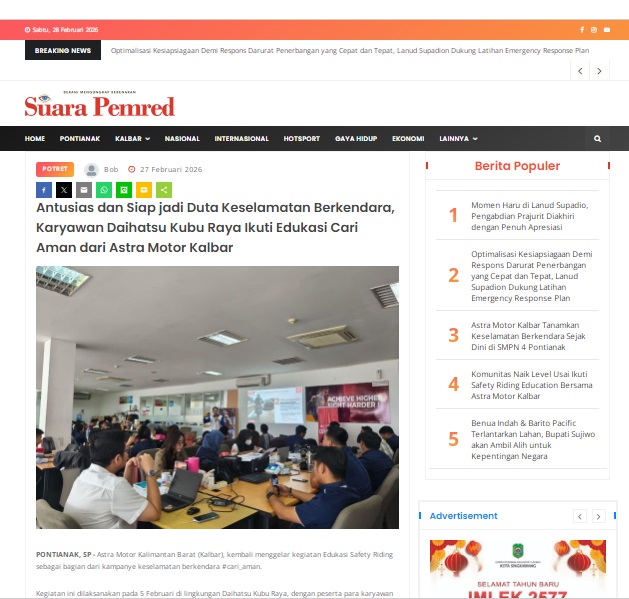 Antusias dan Siap jadi Duta Keselamatan Berkendara, Karyawan Daihatsu Kubu Raya Ikuti Edukasi Cari Aman dari Astra Motor Kalbar by masmul 27 Februari 2026 in Silahkan kunjungi https://www.suarapemredkalbar.com/read/potret/27022026/antusias-dan-siap-jadi-duta-keselamatan-berkendara-karyawan-daihatsu-kubu-raya-ikuti-edukasi-cari-aman-dari-astra-motor-kalbar. You Might Like Regional Public Launching New ADV160 The SUV Pride Grand Launching New PCX 160 Truly Exceptional! Tetap hati-hati ya bro sist berkendara saat hujan.