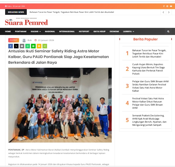 Antusias Ikuti Seminar Safety Riding Astra Motor Kalbar, Guru PAUD Pontianak Siap Jaga Keselamatan Berkendara di Jalan Raya by masmul 23 Januari 2026 in Silahkan kunjungi https://www.suarapemredkalbar.com/read/potret/23012026/antusias-ikuti-seminar-safety-riding-astra-motor-kalbar-guru-paud-pontianak-siap-jaga-keselamatan-berkendara-di-jalan-raya. You Might Like Regional Public Launching New ADV160 The SUV Pride Grand Launching New PCX 160 Truly Exceptional! Tetap hati-hati ya bro sist berkendara saat hujan.