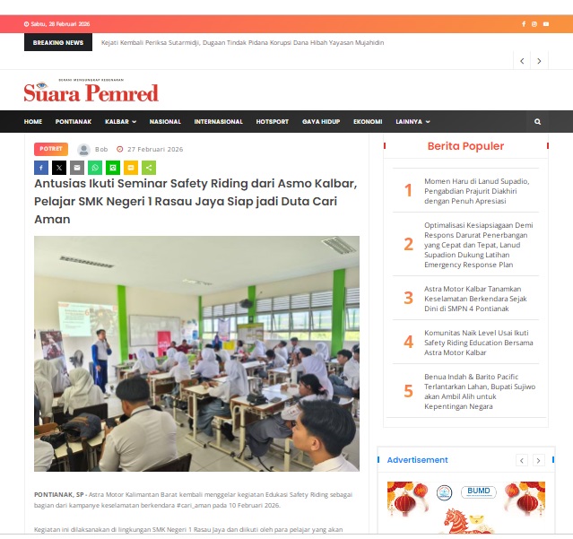 Antusias Ikuti Seminar Safety Riding dari Asmo Kalbar, Pelajar SMK Negeri 1 Rasau Jaya Siap jadi Duta Cari Aman by masmul 27 Februari 2026 in Silahkan kunjungi https://www.suarapemredkalbar.com/read/potret/27022026/antusias-ikuti-seminar-safety-riding-dari-asmo-kalbar-pelajar-smk-negeri-1-rasau-jaya-siap-jadi-duta-cari-aman. You Might Like Regional Public Launching New ADV160 The SUV Pride Grand Launching New PCX 160 Truly Exceptional! Tetap hati-hati ya bro sist berkendara saat hujan.