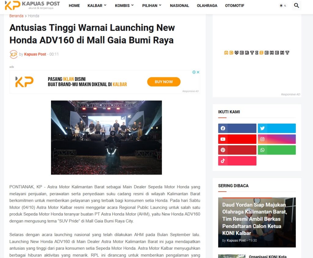 Antusias Tinggi Warnai Launching New Honda ADV160 di Mall Gaia Bumi Raya by Muhammad Arif 22 November 2025 in Silahkan kunjungi https://www.kapuaspost.web.id/2025/11/antusias-tinggi-warnai-launching-new.html. Tags: astra Astra Motor kalbar Astra Motor Pontianak astramotor honda kalbar pontianak sepeda motor You Might Like Regional Public Launching New ADV160 The SUV Pride Grand Launching New PCX 160 Truly Exceptional! Tetap hati-hati ya bro sist berkendara saat hujan.