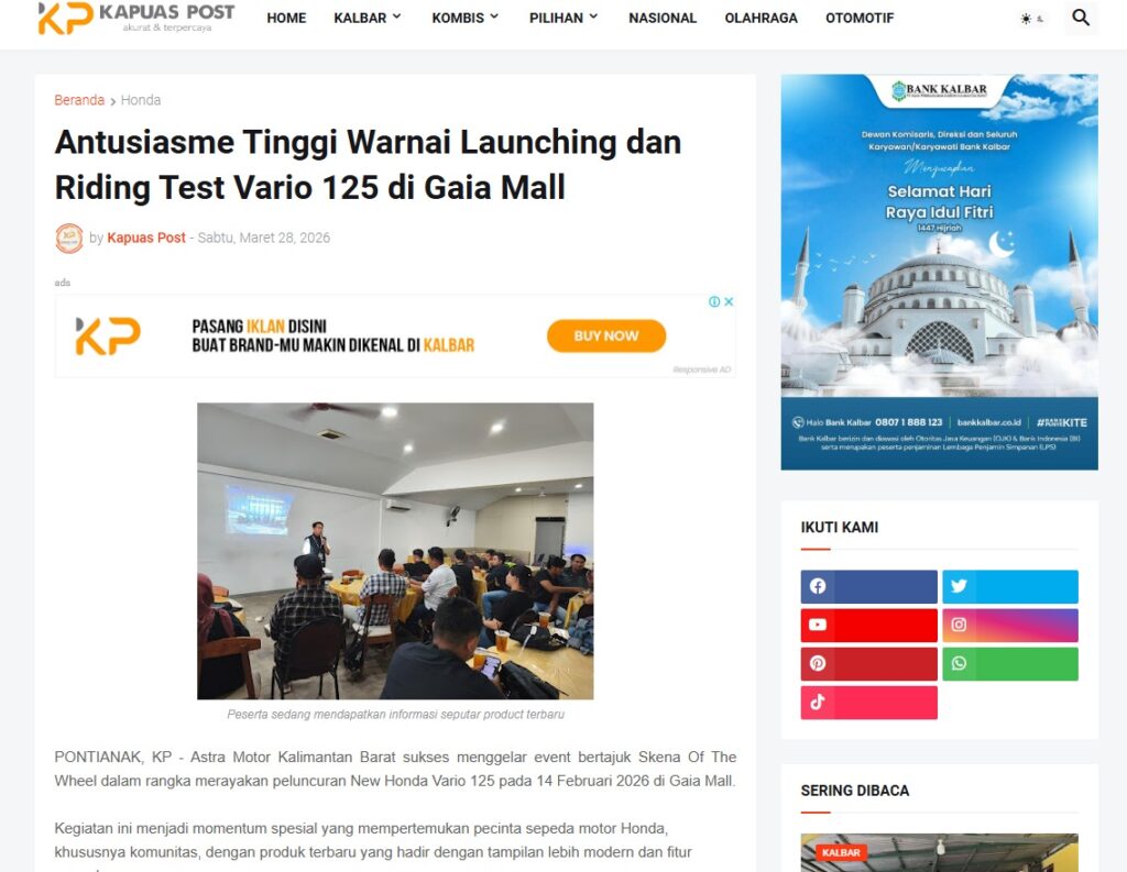 Antusiasme Tinggi Warnai Launching dan Riding Test Vario 125 di Gaia Mall by Muhammad Arif 29 Maret 2026 in Silahkan kunjungi https://www.kapuaspost.web.id/2026/03/antusiasme-tinggi-warnai-launching-dan.html. Tags: astra Astra Motor kalbar Astra Motor Pontianak astramotor honda kalbar pontianak sepeda motor You Might Like Regional Public Launching New ADV160 The SUV Pride Grand Launching New PCX 160 Truly Exceptional! Tetap hati-hati ya bro sist berkendara saat hujan.