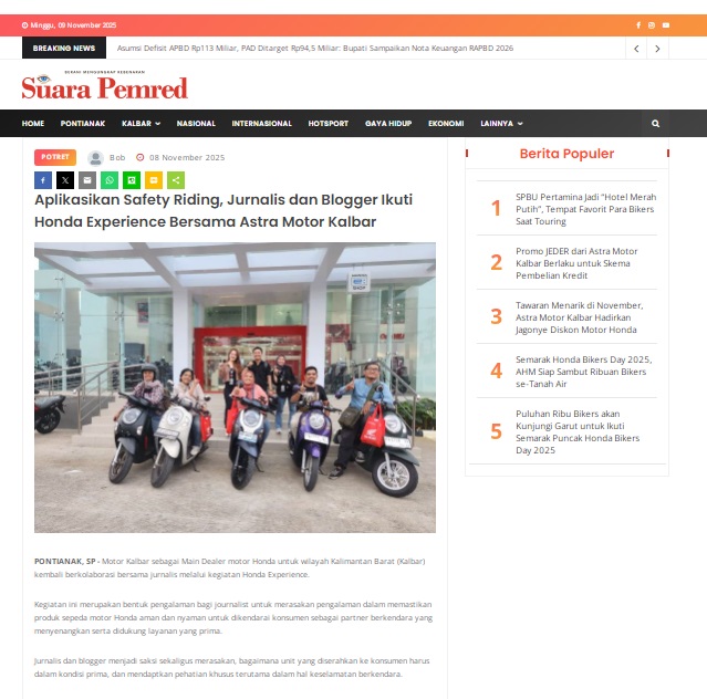 Aplikasikan Safety Riding, Jurnalis dan Blogger Ikuti Honda Experience Bersama Astra Motor Kalbar by masmul 8 November 2025 in Silahkan kunjungi https://www.suarapemredkalbar.com/read/potret/08112025/aplikasikan-safety-riding-jurnalis-dan-blogger-ikuti-honda-experience-bersama-astra-motor-kalbar. You Might Like Regional Public Launching New ADV160 The SUV Pride Grand Launching New PCX 160 Truly Exceptional! Tetap hati-hati ya bro sist berkendara saat hujan.