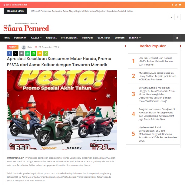 Apresiasi Kesetiaan Konsumen Motor Honda, Promo PESTA dari Asmo Kalbar dengan Tawaran Menarik by masmul 21 Desember 2025 in Silahkan kunjungi https://www.suarapemredkalbar.com/read/potret/21122025/apresiasi-kesetiaan-konsumen-motor-honda-promo-pesta-dari-asmo-kalbar-dengan-tawaran-menarik. You Might Like Regional Public Launching New ADV160 The SUV Pride Grand Launching New PCX 160 Truly Exceptional! Tetap hati-hati ya bro sist berkendara saat hujan.