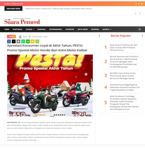 Apresiasi Konsumen Loyal di Akhir Tahun, PESTA: Promo Spesial Motor Honda dari Astra Motor Kalbar by masmul 18 Desember 2025 in Silahkan kunjungi https://www.suarapemredkalbar.com/read/potret/18122025/apresiasi-konsumen-loyal-di-akhir-tahun-pesta-promo-spesial-motor-honda-dari-astra-motor-kalbar. You Might Like Regional Public Launching New ADV160 The SUV Pride Grand Launching New PCX 160 Truly Exceptional! Tetap hati-hati ya bro sist berkendara saat hujan.