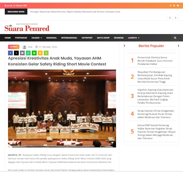 Apresiasi Kreativitas Anak Muda, Yayasan AHM Konsisten Gelar Safety Riding Short Movie Contest by masmul 31 Oktober 2025 in Silahkan kunjungi https://www.suarapemredkalbar.com/read/potret/31102025/apresiasi-kreativitas-anak-muda-yayasan-ahm-konsisten-gelar-safety-riding-short-movie-contest. You Might Like Regional Public Launching New ADV160 The SUV Pride Grand Launching New PCX 160 Truly Exceptional! Tetap hati-hati ya bro sist berkendara saat hujan.