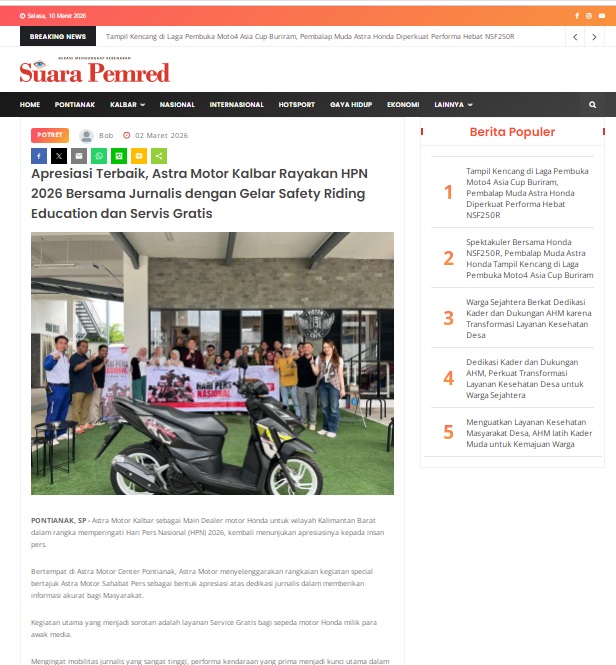 Apresiasi Terbaik, Astra Motor Kalbar Rayakan HPN 2026 Bersama Jurnalis dengan Gelar Safety Riding Education dan Servis Gratis by masmul 2 Maret 2026 in Silahkan kunjungi https://www.suarapemredkalbar.com/read/potret/02032026/apresiasi-terbaik-astra-motor-kalbar-rayakan-hpn-2026-bersama-jurnalis-dengan-gelar-safety-riding-education-dan-servis-gratis. You Might Like Regional Public Launching New ADV160 The SUV Pride Grand Launching New PCX 160 Truly Exceptional! Tetap hati-hati ya bro sist berkendara saat hujan.