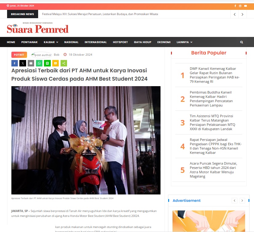 Apresiasi Terbaik dari PT AHM untuk Karya Inovasi Produk Siswa Cerdas pada AHM Best Student 2024 by masmul 18 Oktober 2024 in Silahkan kunjungi https://www.suarapemredkalbar.com/read/potret/18102024/apresiasi-terbaik-dari-pt-ahm-untuk-karya-inovasi-produk-siswa-cerdas-pada-ahm-best-student-2024. You Might Like Regional Public Launching New ADV160 The SUV Pride Grand Launching New PCX 160 Truly Exceptional! Tetap hati-hati ya bro sist berkendara saat hujan.