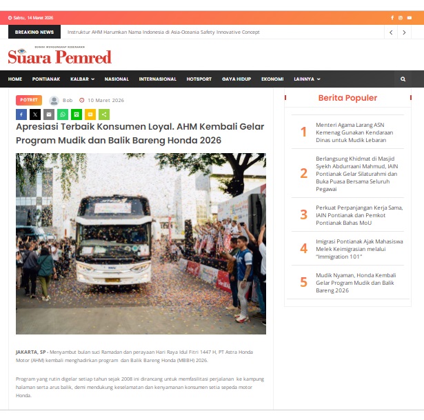 Apresiasi Terbaik Konsumen Loyal. AHM Kembali Gelar Program Mudik dan Balik Bareng Honda 2026 by masmul 10 Maret 2026 in Silahkan kunjungi https://www.suarapemredkalbar.com/read/potret/10032026/apresiasi-terbaik-konsumen-loyal-ahm-kembali-gelar-program-mudik-dan-balik-bareng-honda-2026. You Might Like Regional Public Launching New ADV160 The SUV Pride Grand Launching New PCX 160 Truly Exceptional! Tetap hati-hati ya bro sist berkendara saat hujan.
