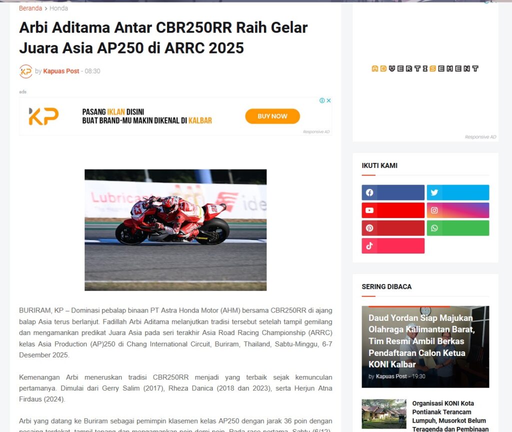 Arbi Aditama Antar CBR250RR Raih Gelar Juara Asia AP250 di ARRC 2025 by Muhammad Arif 9 Desember 2025 in Silahkan kunjungi https://www.kapuaspost.web.id/2025/12/arbi-aditama-antar-cbr250rr-raih-gelar.html. Tags: astra Astra Motor kalbar Astra Motor Pontianak astramotor honda kalbar pontianak sepeda motor You Might Like Regional Public Launching New ADV160 The SUV Pride Grand Launching New PCX 160 Truly Exceptional! Tetap hati-hati ya bro sist berkendara saat hujan.