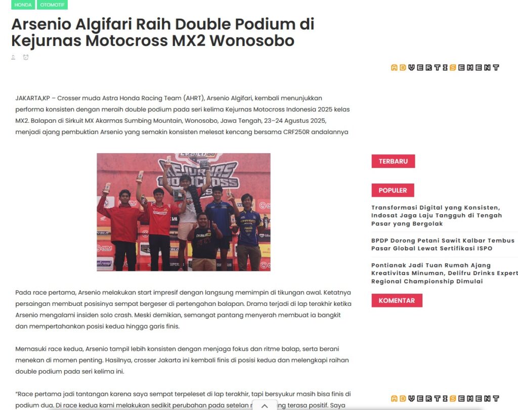 Arsenio Algifari Raih Double Podium di Kejurnas Motocross MX2 Wonosobo by Muhammad Arif 26 Agustus 2025 in Silahkan kunjungi https://www.kapuaspost.web.id/2025/08/arsenio-algifari-raih-double-podium-di.html. Tags: astra Astra Motor kalbar Astra Motor Pontianak astramotor honda kalbar pontianak sepeda motor You Might Like Regional Public Launching New ADV160 The SUV Pride Grand Launching New PCX 160 Truly Exceptional! Tetap hati-hati ya bro sist berkendara saat hujan.