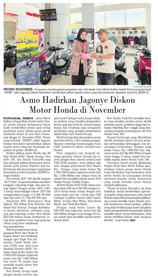 Asmo Hadirkan Jagonye Diskon Motor Honda di November by Ishak Ismail 12 November 2025 in Silahkan buka . You Might Like Regional Public Launching New ADV160 The SUV Pride Grand Launching New PCX 160 Truly Exceptional! Tetap hati-hati ya bro sist berkendara saat hujan.