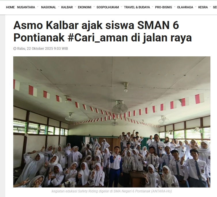 Asmo Kalbar ajak siswa SMAN 6 Pontianak #Cari_aman di jalan raya by Dedi 22 Oktober 2025 in Silahkan kunjungi https://kalbar.antaranews.com/berita/670565/asmo-kalbar-ajak-siswa-sman-6-pontianak-cari-aman-di-jalan-raya. You Might Like Regional Public Launching New ADV160 The SUV Pride Grand Launching New PCX 160 Truly Exceptional! Tetap hati-hati ya bro sist berkendara saat hujan.