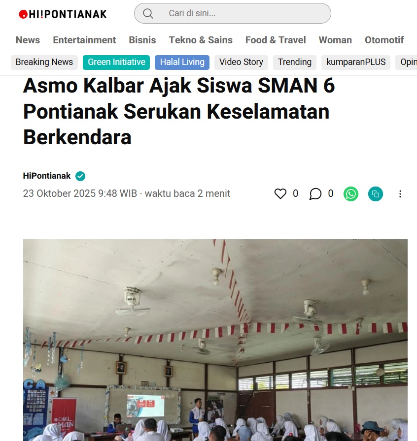 Asmo Kalbar Ajak Siswa SMAN 6 Pontianak Serukan Keselamatan Berkendara by Leo Prima 23 Oktober 2025 in Silahkan kunjungi https://kumparan.com/hipontianak/2664SJltir2?utm_source=App&utm_medium=wa&shareID=yL5EPH4DRDdH. You Might Like Regional Public Launching New ADV160 The SUV Pride Grand Launching New PCX 160 Truly Exceptional! Tetap hati-hati ya bro sist berkendara saat hujan.