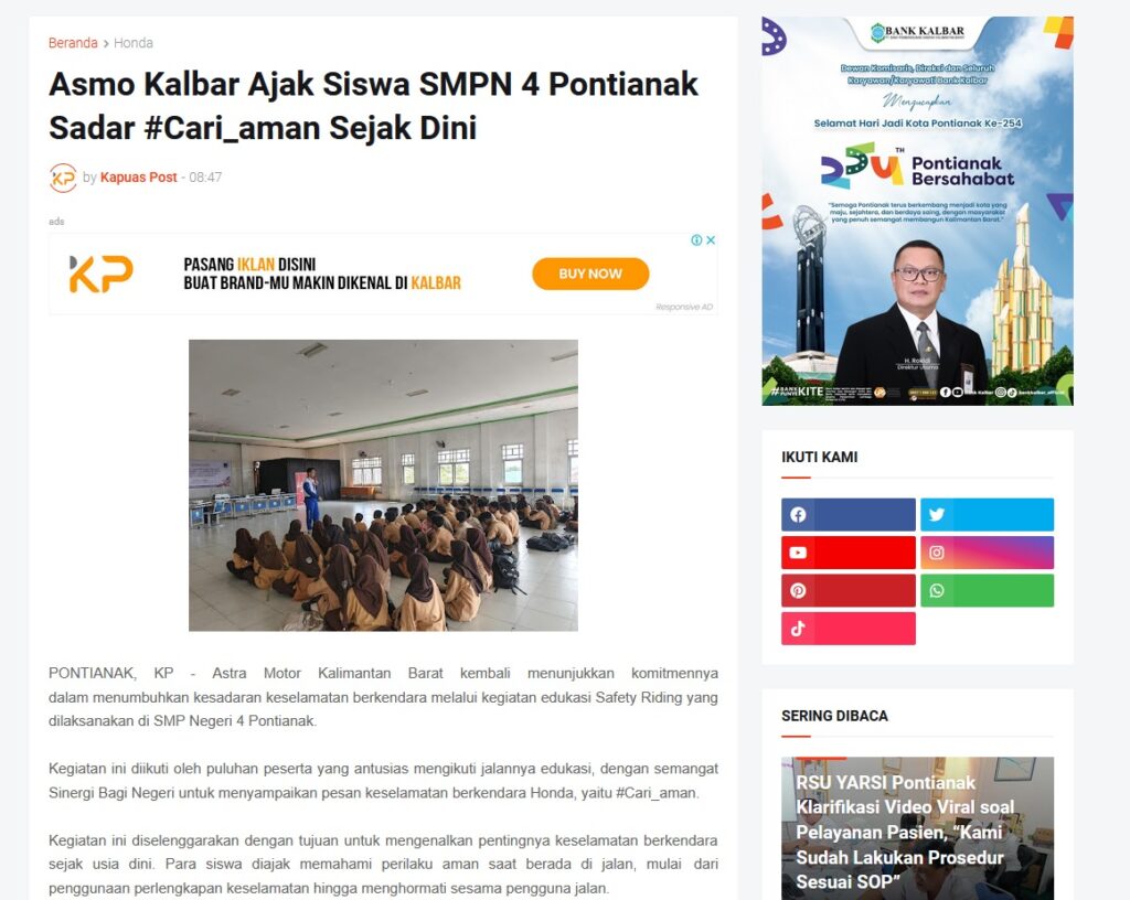 Asmo Kalbar Ajak Siswa SMPN 4 Pontianak Sadar #Cari_aman Sejak Dini by Muhammad Arif 20 Oktober 2025 in Silahkan kunjungi https://www.kapuaspost.web.id/2025/10/asmo-kalbar-ajak-siswa-smpn-4-pontianak.html. Tags: astra Astra Motor kalbar Astra Motor Pontianak astramotor honda kalbar pontianak sepeda motor You Might Like Regional Public Launching New ADV160 The SUV Pride Grand Launching New PCX 160 Truly Exceptional! Tetap hati-hati ya bro sist berkendara saat hujan.