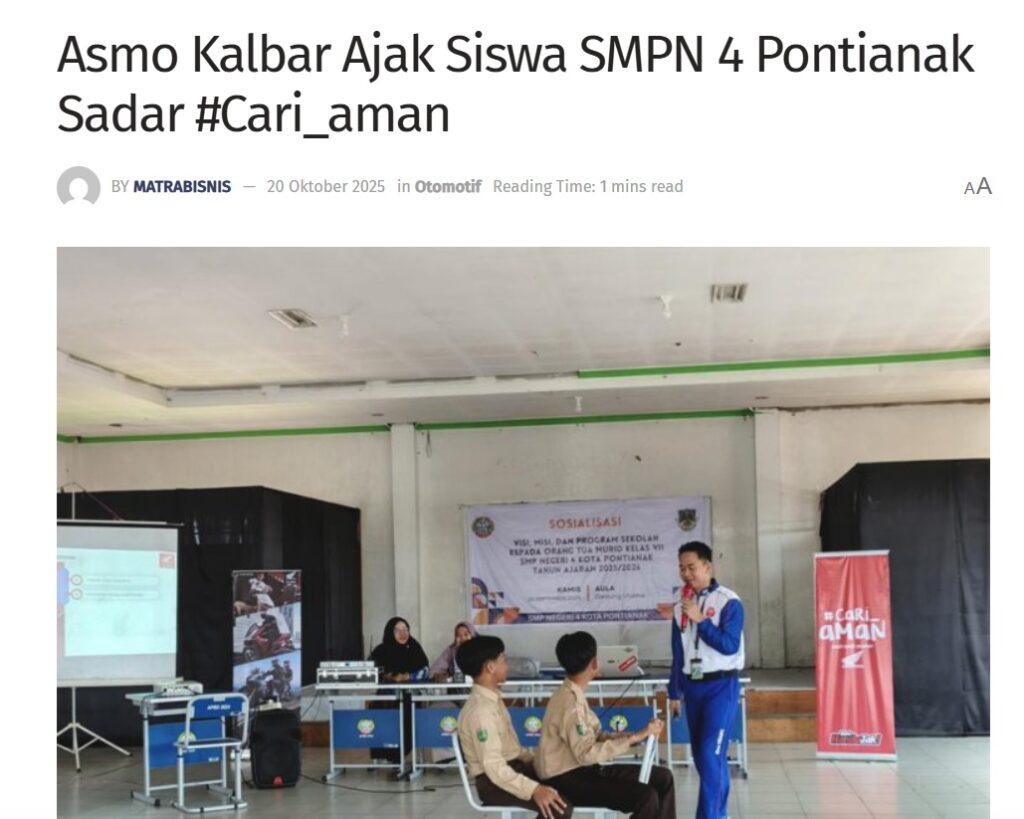 Asmo Kalbar Ajak Siswa SMPN 4 Pontianak Sadar #Cari_aman by Sri Yuliantiningsih 20 Oktober 2025 in Silahkan kunjungi https://matrabisnis.id/2025/10/20/asmo-kalbar-ajak-siswa-smpn-4-pontianak-sadar-cari_aman/. You Might Like Regional Public Launching New ADV160 The SUV Pride Grand Launching New PCX 160 Truly Exceptional! Tetap hati-hati ya bro sist berkendara saat hujan.