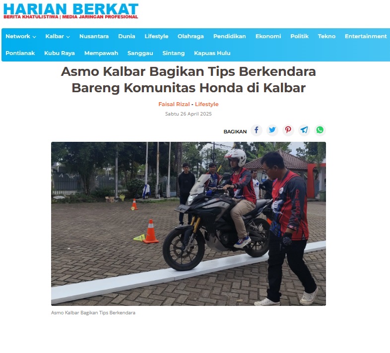 Asmo Kalbar Bagikan Tips Berkendara Bareng Komunitas Honda di Kalbar by Dodi Dodi 26 April 2025 in Silahkan kunjungi https://harianberkat.com/2025/04/26/asmo-kalbar-bagikan-tips-berkendara-bareng-komunitas-honda-di-kalbar/. Tags: Asmo Kalbar Astra Motor kalbar Bareng Komunitas Honda Kalbar Motor Honda PT AHM tips berkendara You Might Like Regional Public Launching New ADV160 The SUV Pride Grand Launching New PCX 160 Truly Exceptional! Tetap hati-hati ya bro sist berkendara saat hujan.