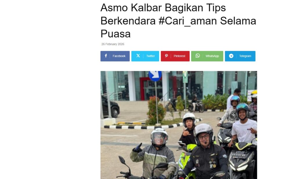 Asmo Kalbar Bagikan Tips Berkendara #Cari_aman Selama Puasa by Nova Sari 26 Februari 2026 in Silahkan kunjungi https://equator.co.id/asmo-kalbar-bagikan-tips-berkendara-cari_aman-selama-puasa/. You Might Like Regional Public Launching New ADV160 The SUV Pride Grand Launching New PCX 160 Truly Exceptional! Tetap hati-hati ya bro sist berkendara saat hujan.