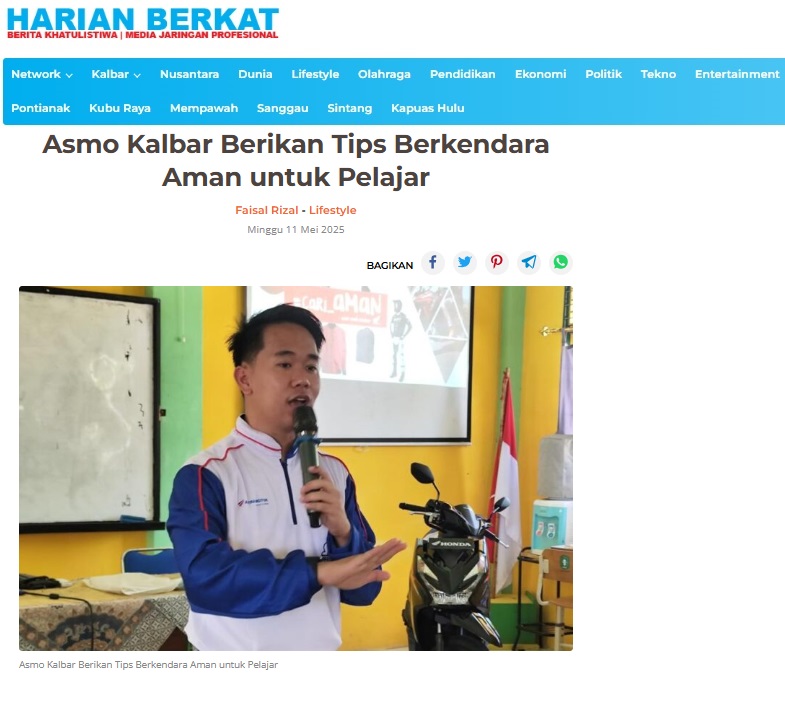 Asmo Kalbar Berikan Tips Berkendara Aman untuk Pelajar by Dodi Dodi 11 Mei 2025 in Silahkan kunjungi https://harianberkat.com/2025/05/11/asmo-kalbar-berikan-tips-berkendara-aman-untuk-pelajar/. Tags: Asmo Kalbar Astra Motor kalbar Berkendara Aman Honda Kalbar Motor Honda PT AHM tips berkendara You Might Like Regional Public Launching New ADV160 The SUV Pride Grand Launching New PCX 160 Truly Exceptional! Tetap hati-hati ya bro sist berkendara saat hujan.