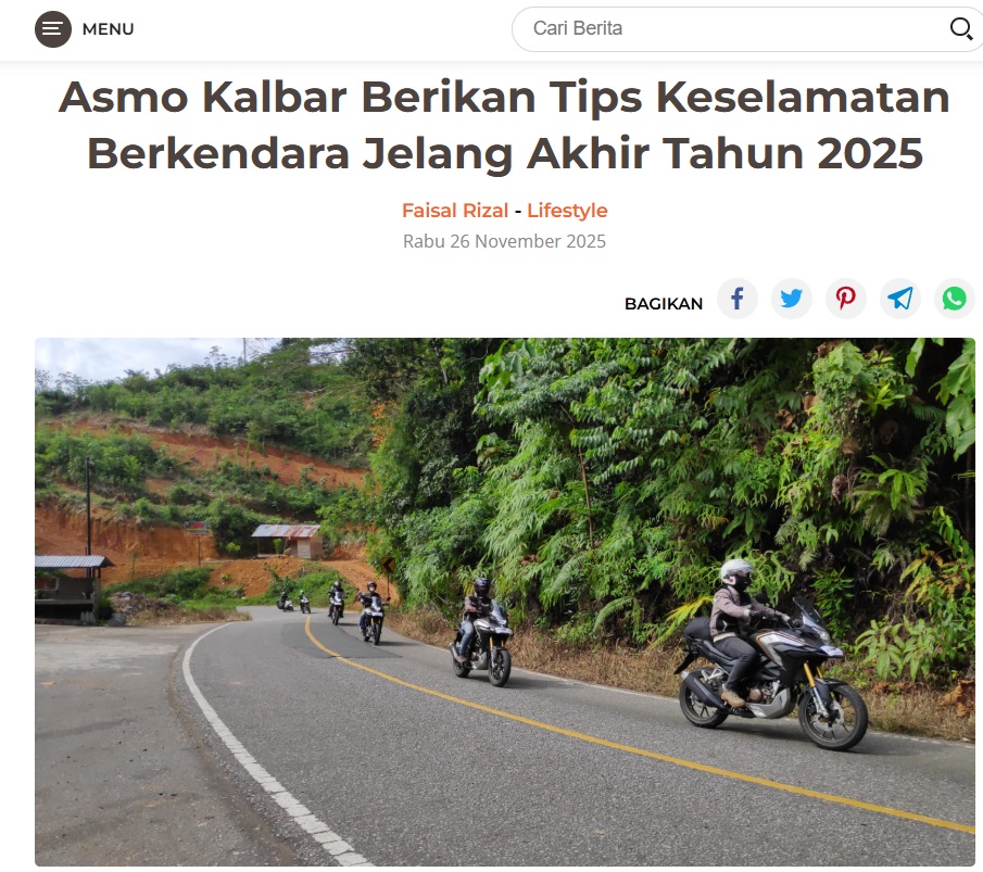 Asmo Kalbar Berikan Tips Keselamatan Berkendara Jelang Akhir Tahun 2025 by Dodi Dodi 26 November 2025 in Silahkan kunjungi https://harianberkat.com/2025/11/26/asmo-kalbar-berikan-tips-keselamatan-berkendara-jelang-akhir-tahun-2025/. You Might Like Regional Public Launching New ADV160 The SUV Pride Grand Launching New PCX 160 Truly Exceptional! Tetap hati-hati ya bro sist berkendara saat hujan.