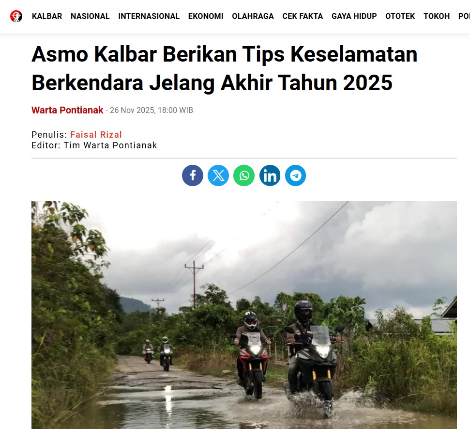 Asmo Kalbar Berikan Tips Keselamatan Berkendara Jelang Akhir Tahun 2025 by Faisal Rizal 26 November 2025 in Silahkan kunjungi https://wartapontianak.pikiran-rakyat.com/gaya-hidup/pr-1179818211/asmo-kalbar-berikan-tips-keselamatan-berkendara-jelang-akhir-tahun-2025. You Might Like Regional Public Launching New ADV160 The SUV Pride Grand Launching New PCX 160 Truly Exceptional! Tetap hati-hati ya bro sist berkendara saat hujan.