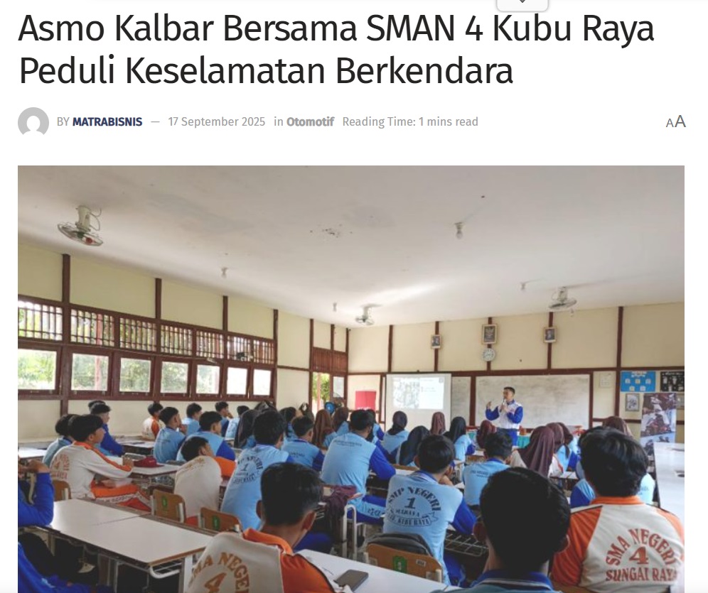 Asmo Kalbar Bersama SMAN 4 Kubu Raya Peduli Keselamatan Berkendara by Sri Yuliantiningsih 17 September 2025 in Silahkan kunjungi https://matrabisnis.id/2025/09/17/asmo-kalbar-bersama-sman-4-kubu-raya-peduli-keselamatan-berkendara/. You Might Like Regional Public Launching New ADV160 The SUV Pride Grand Launching New PCX 160 Truly Exceptional! Tetap hati-hati ya bro sist berkendara saat hujan.