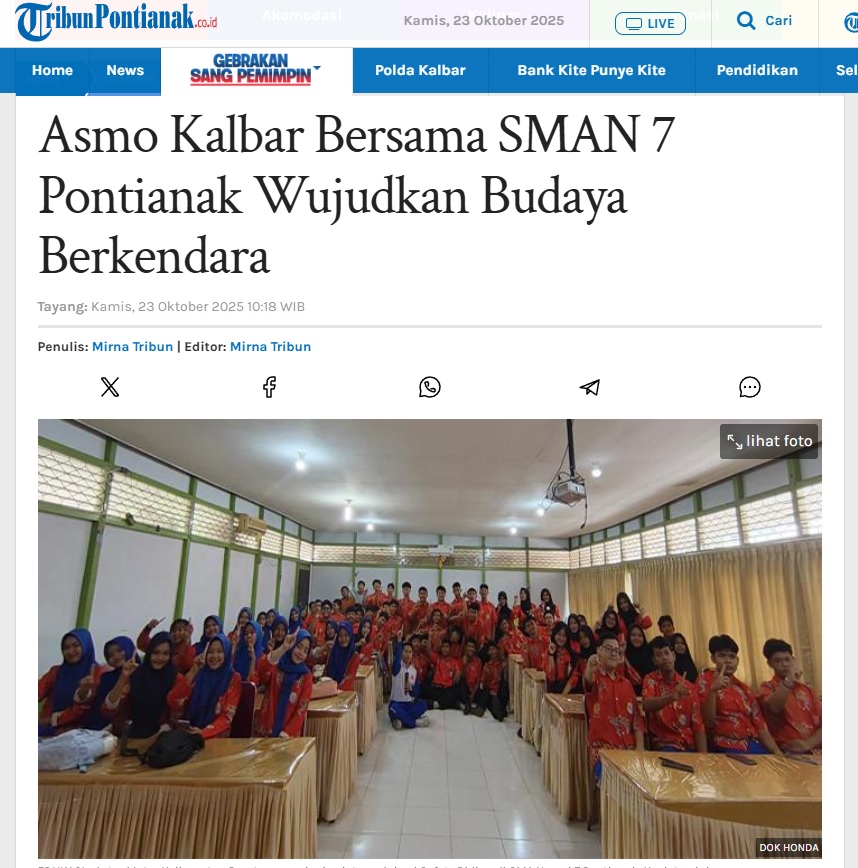 Asmo Kalbar Bersama SMAN 7 Pontianak Wujudkan Budaya Berkendara by Ishak Ismail 23 Oktober 2025 in Silahkan kunjungi https://pontianak.tribunnews.com/otomotif/1146908/asmo-kalbar-bersama-sman-7-pontianak-wujudkan-budaya-berkendara. You Might Like Regional Public Launching New ADV160 The SUV Pride Grand Launching New PCX 160 Truly Exceptional! Tetap hati-hati ya bro sist berkendara saat hujan.