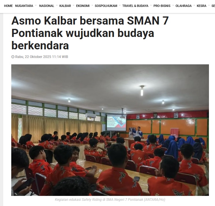 Asmo Kalbar bersama SMAN 7 Pontianak wujudkan budaya berkendara by Dedi 22 Oktober 2025 in Silahkan kunjungi https://kalbar.antaranews.com/berita/670609/asmo-kalbar-bersama-sman-7-pontianak-wujudkan-budaya-berkendara. You Might Like Regional Public Launching New ADV160 The SUV Pride Grand Launching New PCX 160 Truly Exceptional! Tetap hati-hati ya bro sist berkendara saat hujan.
