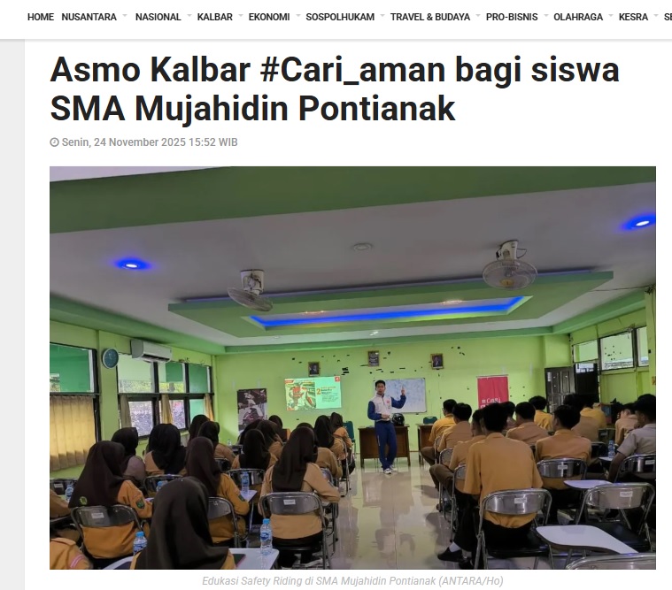Asmo Kalbar #Cari_aman bagi siswa SMA Mujahidin Pontianak by Dedi 24 November 2025 in Silahkan kunjungi https://kalbar.antaranews.com/berita/675109/asmo-kalbar-cari-aman-bagi-siswa-sma-mujahidin-pontianak. You Might Like Regional Public Launching New ADV160 The SUV Pride Grand Launching New PCX 160 Truly Exceptional! Tetap hati-hati ya bro sist berkendara saat hujan.